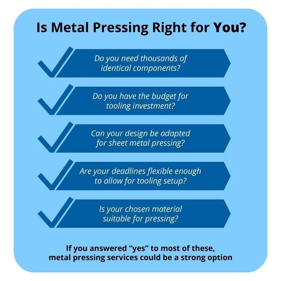 While pressing excels at high-speed production once running, the initial setup can take longer than other methods due to toolmaking and design testing. If you need parts urgently, machining or laser cutting may provide a faster turnaround.